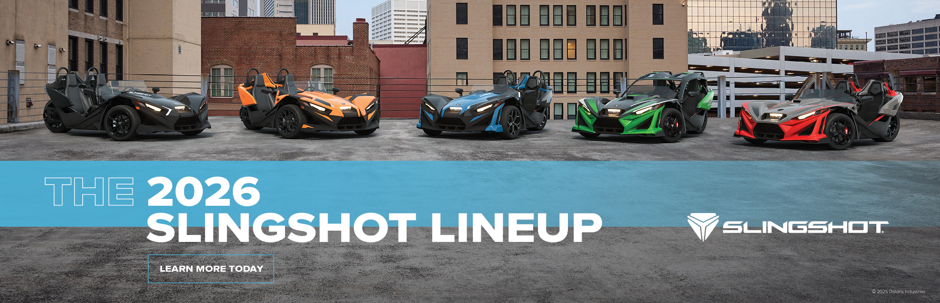 This is a limited time offer which is valid for the purchase of selected qualifying models and is subject to credit approval on qualified purchases financed during this program. Offer may not be combined with certain other offers, is subject to change and may be extended or terminated without further notice. Offer valid on new 2026 Slingshot® models. Monthly payment and cost of borrowing will vary depending on amount borrowed and down payment/trade. Minimum amount to finance is $5,000. Example: $28,299 financed at 0.99% APR over 36 months = 36 monthly payments of $718; financed amount of $25,469 with $2,830 down payment, total cost of borrowing of $390 and a total obligation of $25,860. An example of monthly payments required on a 36-month term at 1.99% APR is $28.20 per $1,000 financed. Monthly payment examples assume 10% down and do not include taxes, title, and other fees. Offer only valid to qualified customers, not all customers will qualify, other offers available, see dealer for details. Offer Valid: April 1 – 30, 2026.